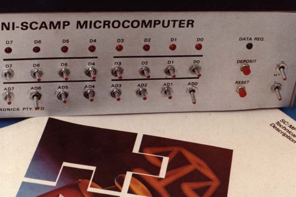 I built this Mini-Scamp microcomputer in 1976 (I think). It was a Dick Smith Electronics (DSE) kit from the days when Dick Smith actually owned and ran Dick Smith electronics. The design was published in "Electronics Australia" (EA). It was based on the SC/MP CPU from National Semiconductors. It boasted a massive 256 bytes of RAM (yes Bytes not Kbytes) - this was 4 times more than the earlier model. It had no ROM or EEPROM of any kind. The complete user inferface is visible in the photo above. Binary code was entered into the RAM by dialing up the data byte and address in binary using toggle switches. Pressing the deposit button stored the byte in memory. The LEDs showed the current contents of the memory location. After the program was enter in this manner one of the switches on the right was flipped from DMA to run mode and the micro executed the code (the other switch was power). The micro could display bytes on the LEDs and read bytes from the data switches - the request LED was there to signal the user to enter a byte and press deposit. No problem with Y2K bugs, viruses or hackers here.