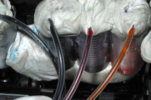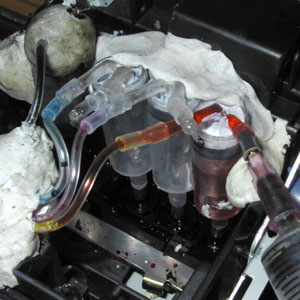This works pretty well but I'm worried I'll break a glass tube off if I have to re-prime. Also in this photo the V4 style setup on the black ink nipple is visible on lower left along with the bleed needle and cap. The color ink nipples are visible at the bottom of the photo. | ||
