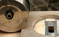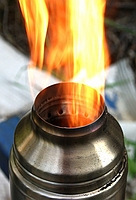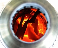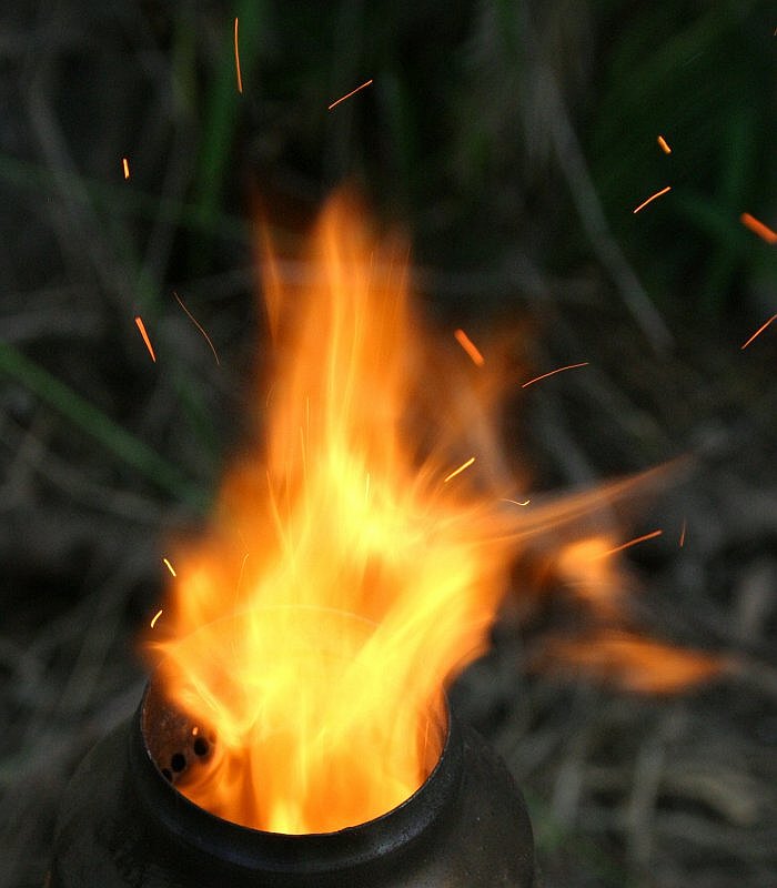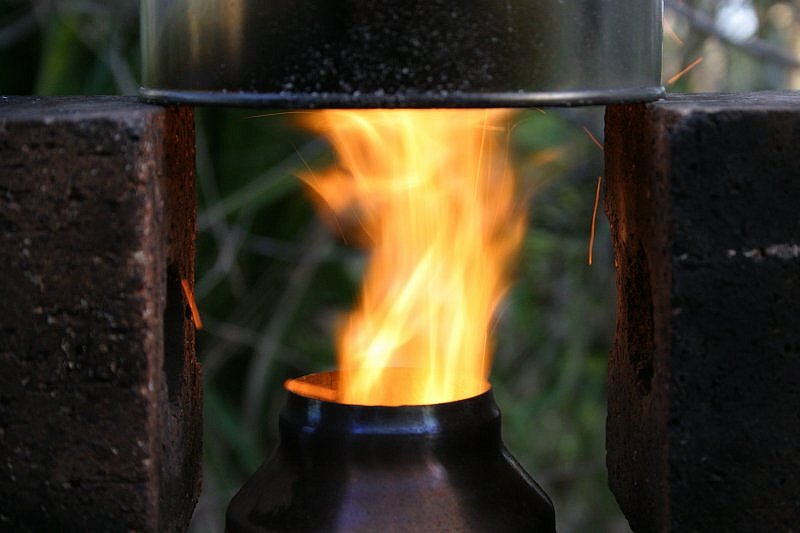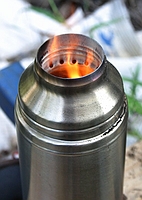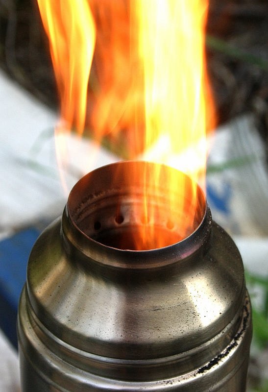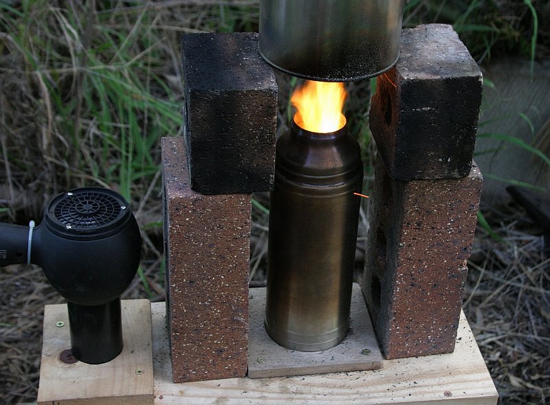 The first test was in my kitchen without any fan forcing. For fuel I used newspaper. The kitchen rapidly filled with smoke. I let it burn and quickly organized a blower. Holding the flask in my left hand (warm at this stage but not hot) I held the blower to the hole in the bottom. As soon as the blower came close to the hole the flame flared up – the smoke ignited and a smokeless flame some 400mm long leapt from the flask. This was accompanied by a soft roar like a jet engine.