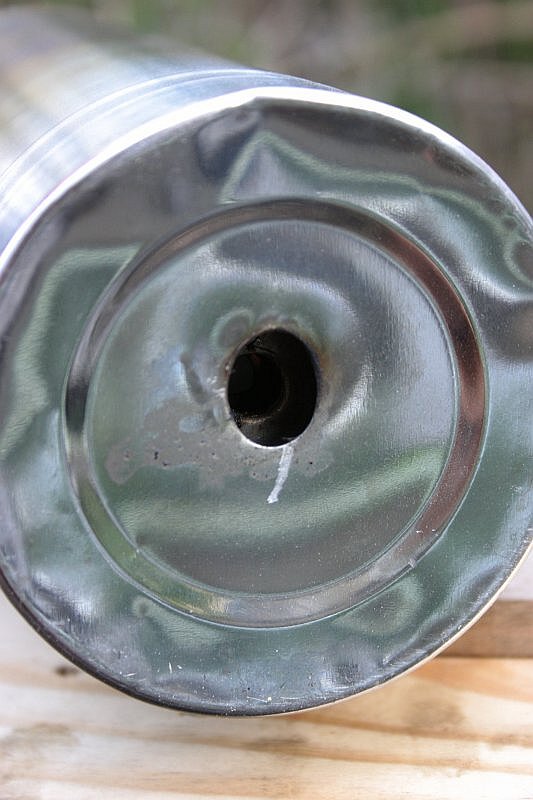 I had no idea how these flasks are constructed. I would not have been surprised to find they weren't really vacuum flasks at all but they are. I think they are quite well made for the price. I paid $14.99 au$ from “Crazy Clarke”. It wasn't till I made stove number three that I discovered the bottom is a press fitted cap. I wanted to make it as simple as possible and then tweak things till the stove worked. When I drill a hole through the centre of the bottom I hit a copper tube and the drill wandered and made a mess of the outer hole.